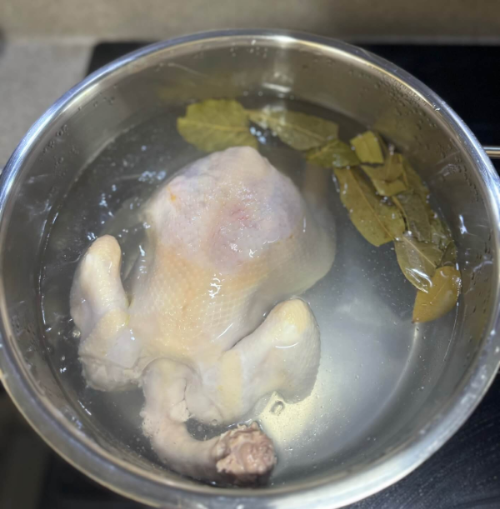 먼저 기름기를 제거하기 위해 큰 냄비에 물을 넣고 끓을 때쯤 닭을 넣어 살짝 데쳐줍니다. 이렇게 기름기를 제거하면 국물이 더 담백해지지요. 그리고 닭 비린내를 없애기 위해 저는 월계수 잎을 넣었어요. 이때 청주나 소주를 넣어도 좋습니다.